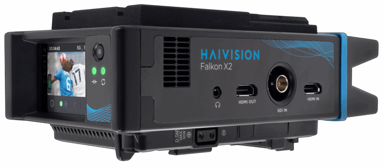 Портативный видеопередатчик Haivision Falkon X2, разработанный для профессионалов, работающих в полевых условиях , может быть подключен непосредственно к профессиональным видеокамерам с помощью креплений V-Mount или Gold-Mount, или же его можно носить в специально разработанном рюкзаке. Благодаря встроенному перезаряжаемому аккумулятору, интуитивно понятному сенсорному экрану и расширенному веб-интерфейсу вы всегда готовы к прямой трансляции с Falkon X2.